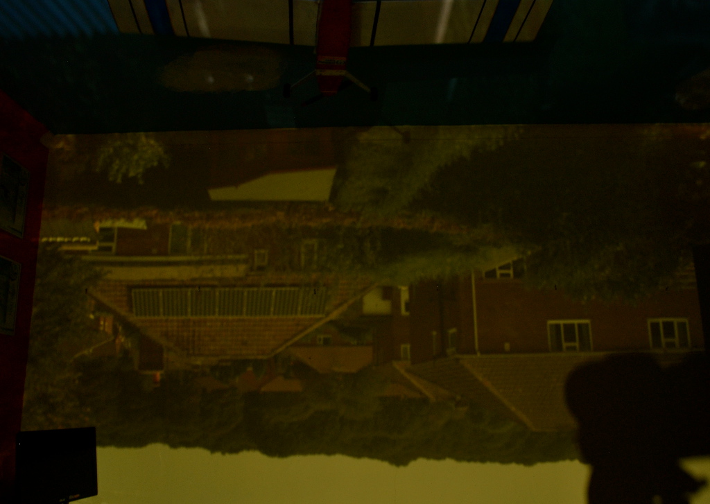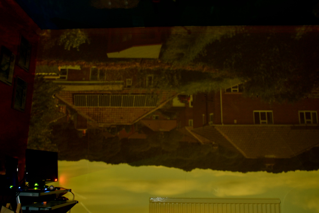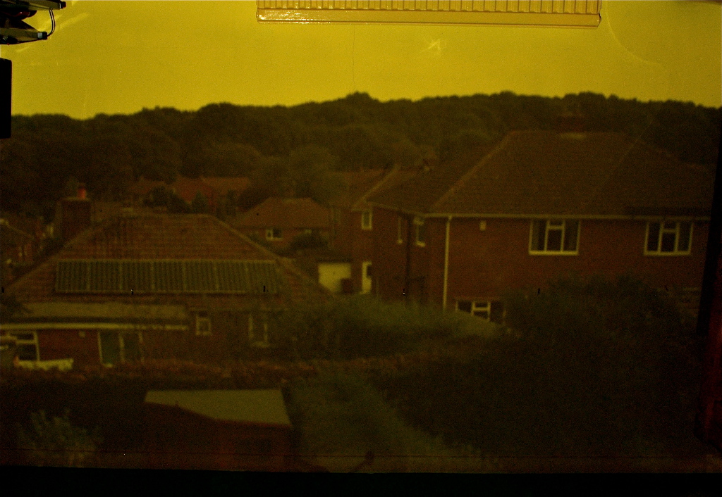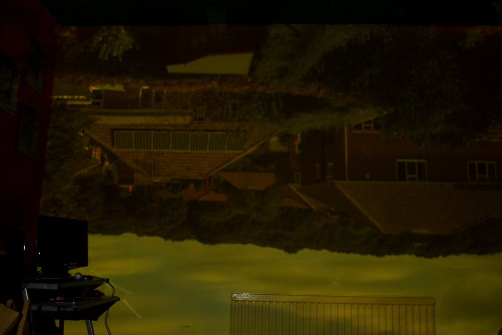 My interest in photography led me to experimenting with the idea of the Camera Obscura, courtesy of my son’s bedroom. The basic idea was to turn his bedroom into a camera. By simply blocking out any available light that came into the room and cutting a small hole in the material which covered the window, we were able to have a projection of the view out of the back of the house, upside down of course. I then took several long exposures of the projection and rotated it. The final image is a nine minute exposure.