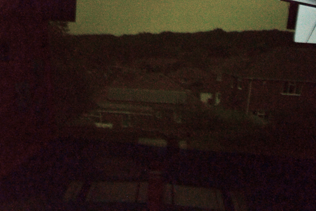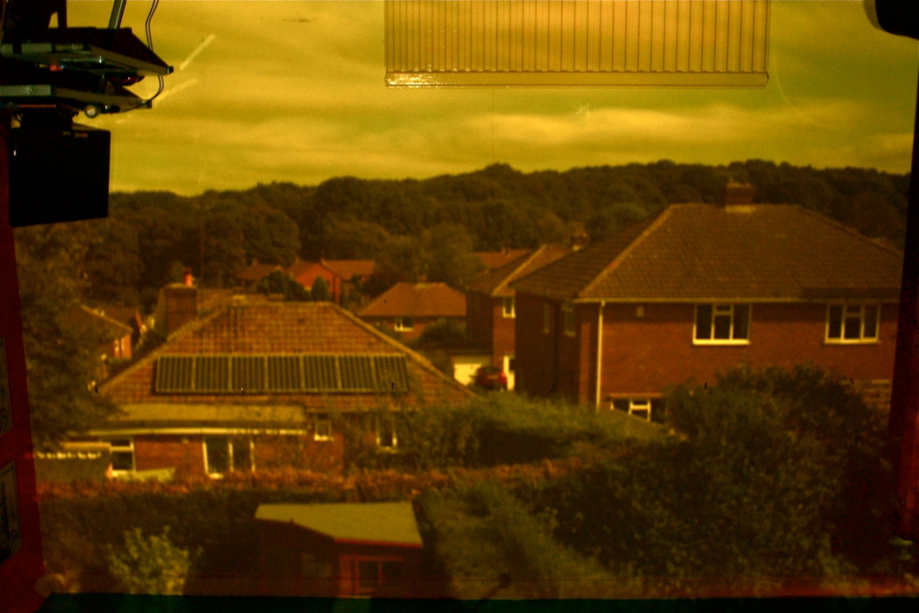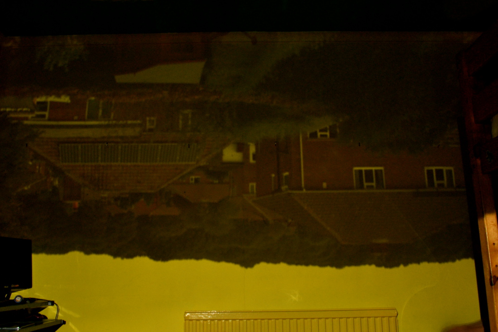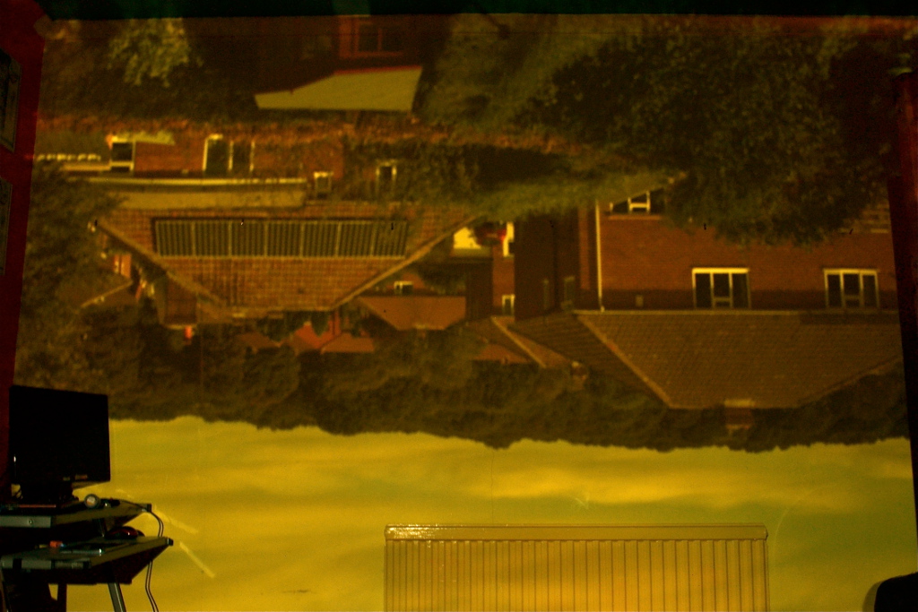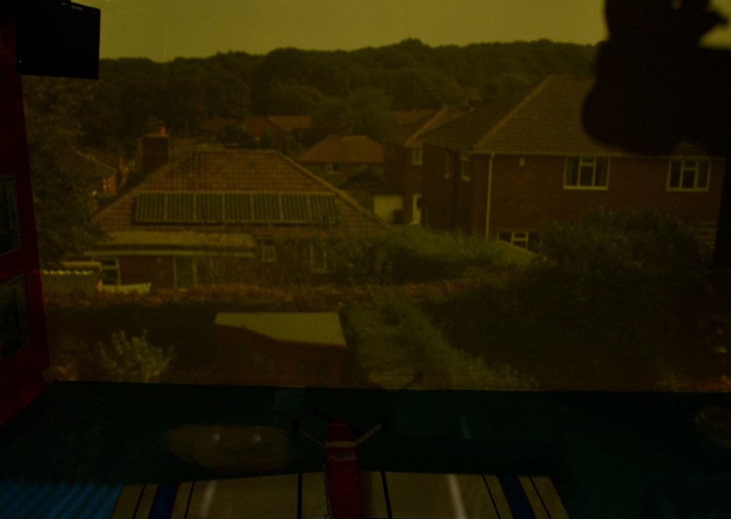 My interest in photography led me to experimenting with the idea of the Camera Obscura, courtesy of my son’s bedroom. The basic idea was to turn his bedroom into a camera. By simply blocking out any available light that came into the room and cutting a small hole in the material which covered the window, we were able to have a projection of the view out of the back of the house, upside down of course. I then took several long exposures of the projection and rotated it. The final image is a nine minute exposure.